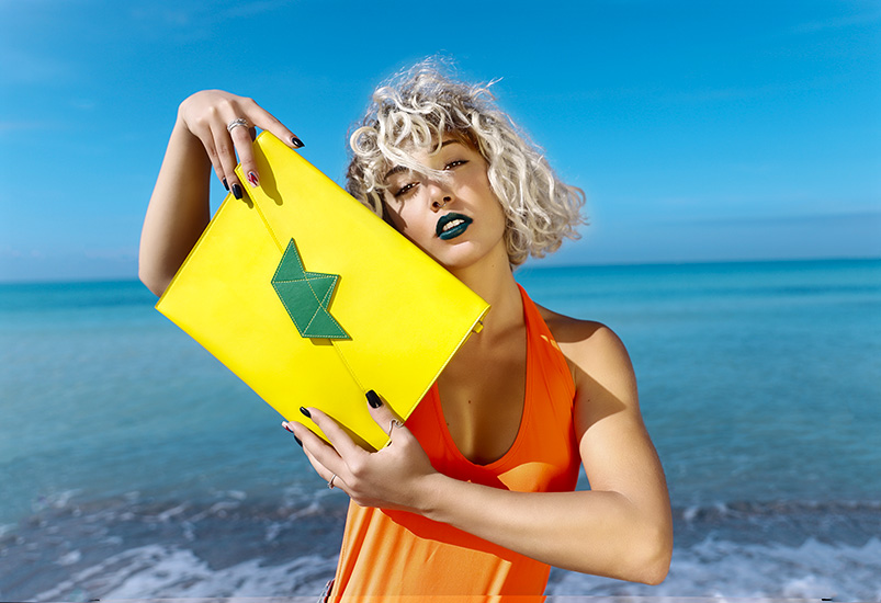 La mia nuova collezione, Neon Summer, è un esplosione di colori, ho coniugato i tipici colori saturi anni 90′ ad alcune nuance tipiche della mia adolescenza inizio 2000. In più, per la prima volta, ho iniziato a usare anche altri materiali oltre la pelle, come rafia, tessuti e lurex. Ho aumentato la gamma di prodotti e ho creato anche una linea di accessori.