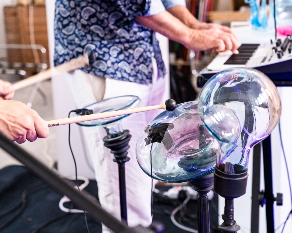 Abbiamo prodotto dei veri e propri strumenti musicali in vetro, acustici ed elettronici, che suono dal vivo insieme alla polistrumentista e cantante Marzia Stano (in arte Una) in una performance musicale.